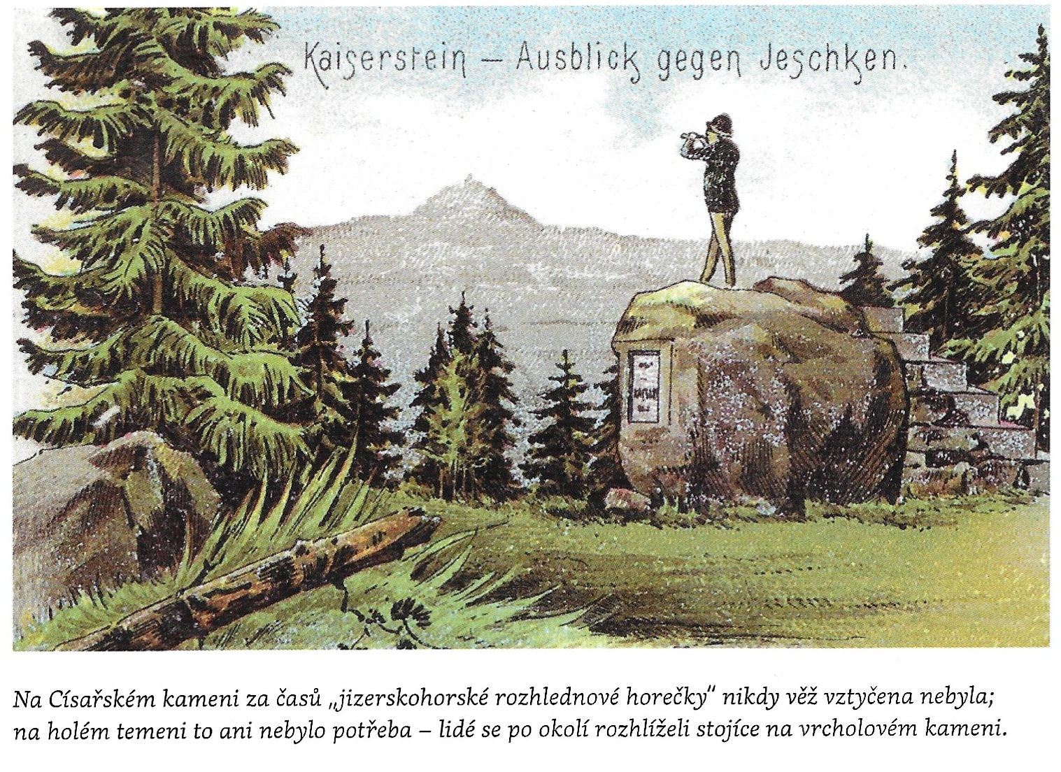 Byť vrchol leží na katastru Vratislavic, za svůj jej vždy brali také Jablonečtí, protože jejich okres již tehdy zahrnoval vesničku Milíře, s Císařským kamenem neodmyslitelně spojenou. Z liberecké, ale především z jablonecké strany přitáhly tenkrát tisícihlavé davy lidí, při cestě od Milířů stály stánky s občerstvením a boudy prodavačů pouťového zboží. Dívky z Dlouhého Mostu kráčely pomalu a důstojně v bílých šatech a nesly na nosítkách relikvii = ozdobenou židli, na níž prý císař kdysi seděl pod lipami u šenku v jejich obci, obědval a popíjel vodu z blízké studny. Jedna mladá panna přicházela s rudým polštářkem, na němž ležel dukát, který tehdy Josef věnoval místní šenkýřce. Na vrcholové skále pronášeli slavnostní řeči o šlechetnosti a moudrosti císaře obecní představený z Dlouhého Mostu Wilhelm Hůbel a učitel Franz Tópper. Předseda čtenářského spolku pan Franz Reichelt přednesl svoji báseň složenou pro tuto příležitost. Byla to typická vlastenecká slavnost konce 19. století, která nemohla skončit jinak než bujarou veselicí. Vážení Jablonečané — lékárník Adolf Ullrich, okresní hejtman Wražda baron z Kunvaldu, Adolf a Heinrich Pfeifferovi, Anton Seidemann, Franz Stütz a Anton Weiss nechali do žulové skály v nejvyšším místě vrcholu zasadit pamětní tabuli se jménem císaře, letopočtem 1778 a datem slavnosti. Žulová skála i deska z mramoru bez větší újmy přežily dodnes, výhled z Císařského kamene ale po více jak sto letech zakryly stromy. Bylo proto úžasné, že sdružení všech obcí nacházejících se okolo kopce, a nesoucí dokonce i jeho název, přišlo na počátku 21 století s nápadem postavit na Císařském kameni rozhlednu. Její budování skutečně začalo na podzim roku 2008, věž byla dokončena v červnu následujícího roku. Stavbu podle projektu jabloneckého sdružení projektantů TOINSTA prováděla rychnovská společnost TAXUS. Náklady stavby ve výši necelých dvou milionů korun kryly všechny okolní obce a příspěvek Libereckého kraje. Nová věž na Císařském kameni je v Jizerských horách poměrně unikátní použitým materiálem.