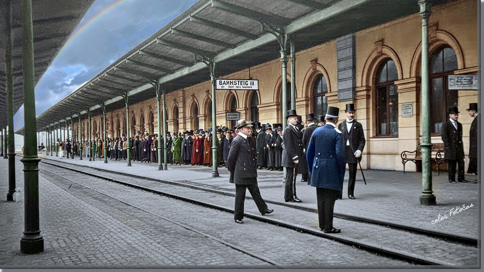 fotografii vidíme slavnostní okamžik na železniční stanici v tehdejším