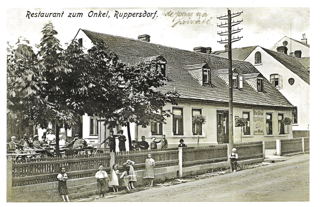 Po několika metrech jsme se dostali na významnou křižovatku cest před ruprechtický konsum. Na tomto místě je rovněž obecní rybník. My pokračujeme do samého středu obce a míjíme č.p. 24, kde má pan Heinrich Schulze hospodu "U zlaté koruny"