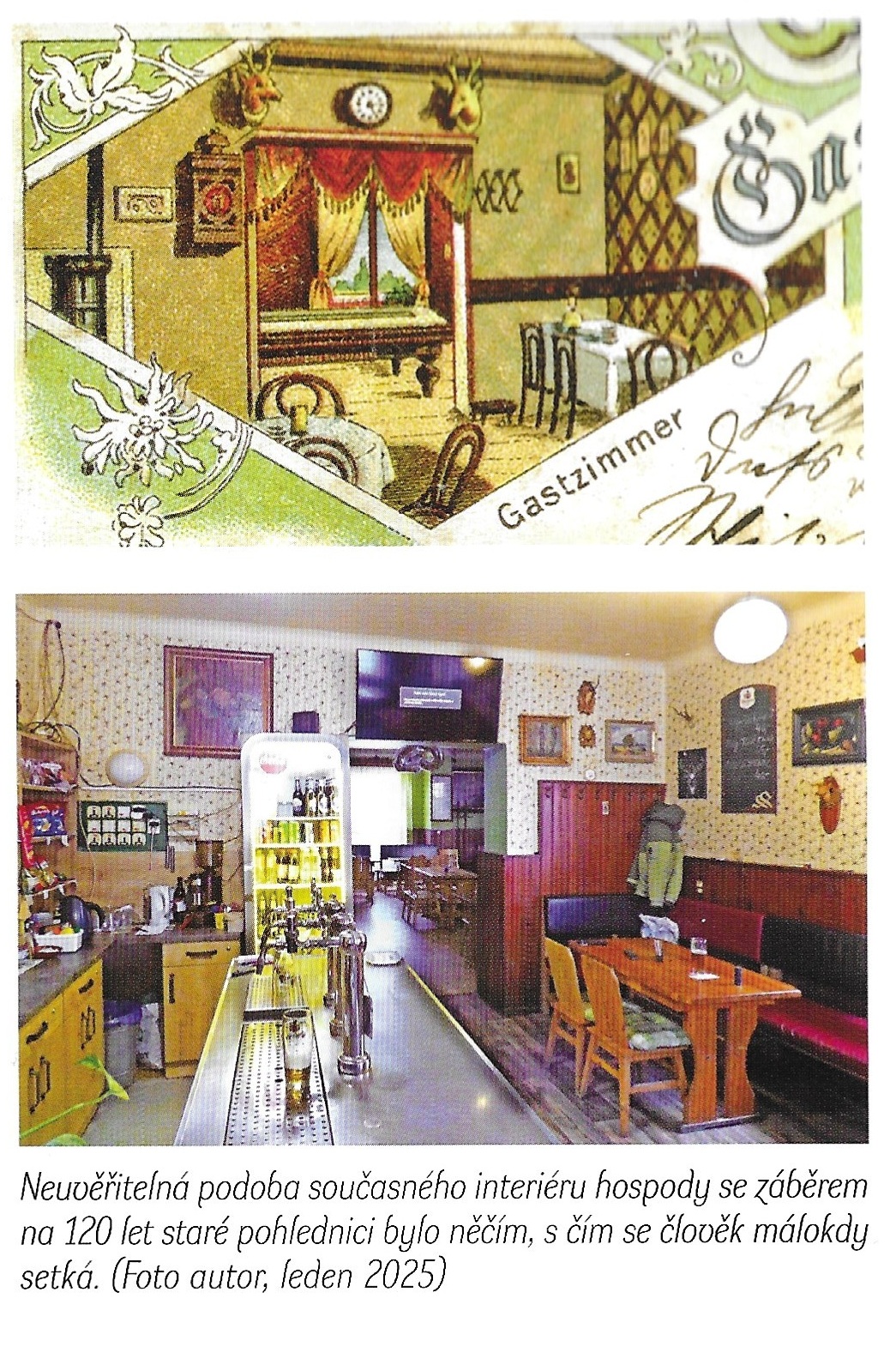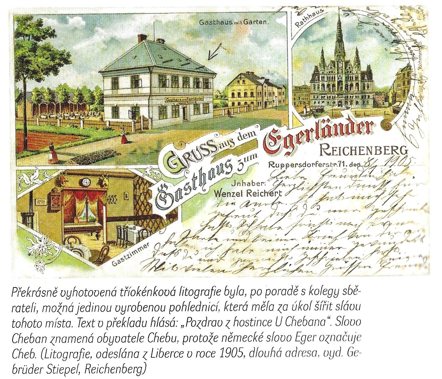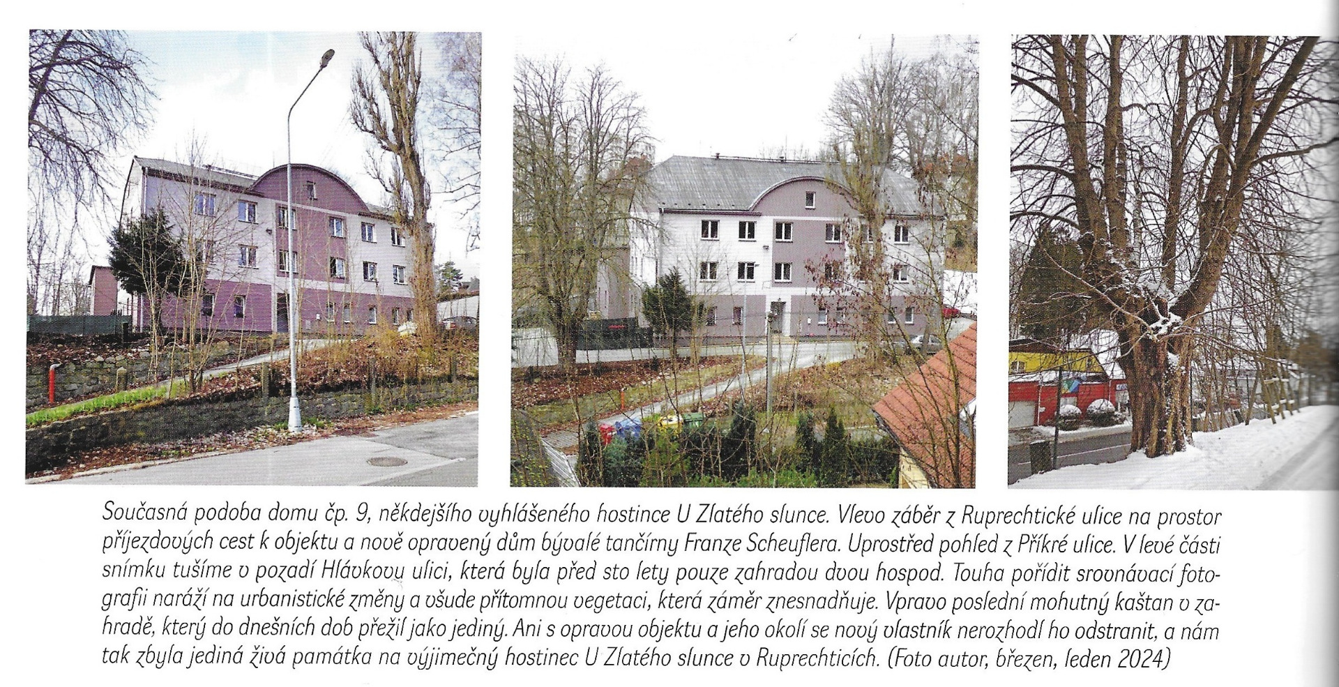 Ke konci povídání o ruprechtických hospodách musím zmínit i jednu, která byla nejdříve libereckou a poté se řízením města stala ruprechtickou. Obec Ruprechtice tak získala ikonickou pivnici. Vystavěna byla kolem roku 1894 při Ruppersdorfer Strasse (ul. Ruprechtická) jako čp. 71. Adresář z roku 1936 ji však uvádí jako čp. 109. Jaké bylo původní určení patrové budovy, není jasné, ale hospoda v ní byla provozována od roku 1900 do roku 1941 (Jiří Bock, Liberecké hospody, 2022). V roce 1905 byl provozovatelem hostince s netradičním názvem Wenzel Reichert. Na krásné, litograficky vyvedené dobové pohlednici se na čelní straně budovy vyjímá jeho vývěsní štít. Dalším lákadlem pro návštěvníky byla zahradní restaurace ve dvoře a uvnitř sálavé teplo od kamen při pití piva i hraní kulečníku. Dalším majitelem je v adresáři roku 1936 uveden Fritz Rubasch-Brand. Tuto vždy pivem a kouřem páchnoucí hospodu U Jelena jsem začal přes ventilátor vnímat už jako chlapec, který okolo prochází za ruku s maminkou cestou do města. A byla to hlavně Ruppersdorfer Strasse, která od nepaměti spojovala město Reichenberg s obcí Ruppersdorf. Proto, když se několikrát posouvaná společná hranice dostala od dnešního Českoněmeckého setkávacího centra k židovskému hřbitovu, připadl Egerlánder do katastru Ruprechtic. Nejčastějšími návštěvníky, kromě štamgastů, bývali prý vojáci základní služby, kteří k ní neměli z obou kasáren daleko. Chci na tomto místě teď čtenáři zdůraznit, že každá hospoda v našich Ruprechticích byla a je pro nás něčím zajímavá, ale zdejší objekt na mě zapůsobil opravdu silně. Určitě to odstartovalo získání zmíněné dobové pohlednice, kterou bylo nutné nejdříve správně přečíst a lokalizovat. Badatelská radost i muka zároveň. Na obrázku neseděl název hospody historicky typický pro Ruprechtice, ani vepsané číslo popisné. Jediné slovo "Ruppersdorferstr." bylo jasným vodítkem. Jinou takovou Liberec prostě nemá. A tak se přede mnou v létě 2023 na Ruprechtické ulici otevřela pověstná "devátá brána" a já vstoupil. Dále již není potřeba být poetický, hostinec mě nadchnul malým počtem hostů, malou paní servírkou, malou nab dkou nápojů i menu, malým prostorem i malým venkovn m posezením mezi malými kaštany. Všechno to ale působí dokonale při srovnávacím pohledu na více než sto let starou pohlednici, která tyto prostory zobrazuje v takřka nezměněné podobě. Bylo to omračující, dokonale historické, čas zastavující. Jenom kulečník chyběl k absolutní věrnosti obrazu. U pípy se mi dostalo odpovědi, že byl odstraněn asi před rokem. Škoda, zamýšlená fotografie s odstupem 120 let mohla být úplně dokonalá. Připadalo mí nemožné, že je zde, stejně jako na pohlednici, na stěně pár loveckých trofejí a venku sedí hosté pod stejnými kaštany jako v roce 1905. Přemýšlel jsem tehdy, jestli bych se z té radosti odhalení poslední ruprechtické hospody odvážil napít zdejšího čepovaného piva. Celoživotní abstinent ve mně ale k šenkýřce cílené věty nenasměroval. Zůstal jsem stejný jako tato ruprechtická hospoda.