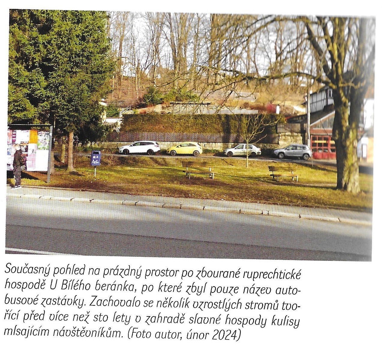 Pokračujeme a již před sebou vidíme krásnou zahrádku tvořenou kaštany s mohutnou lípou v čele. Tato zahrádka patří k restauraci "U bílého beránka", aby ji nikdo nepřehlédl tak ji paní Anna Ganzelová nechala postavit tak, aby byla vysunuta trochu do ulice. To se ji ale stalo osudným a hned v roce 1945 byla budova s č.p. 49 zbořena, aby nepřekážela provozu. Stála přesně tam, kde je dnes záliv pro stanici autobusu. Zůstal po ní jen název zastávky a krásné stromy.