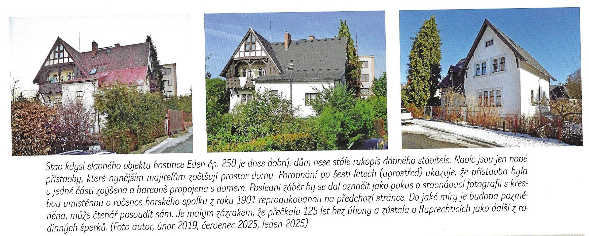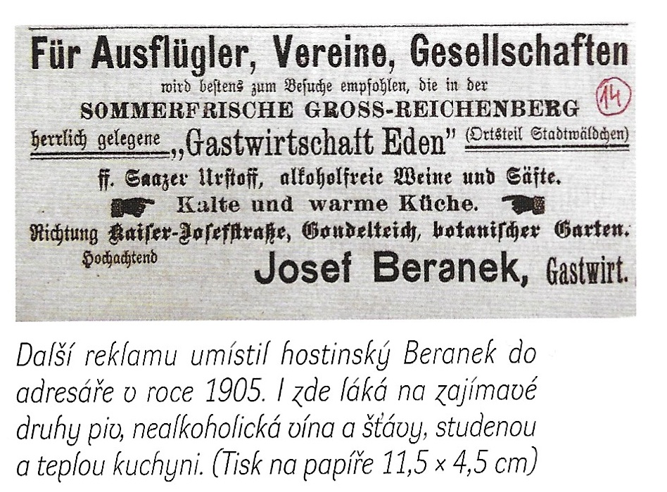 Tento výjimečný druh pohostinství byl ruprechtickým představen kolem roku 1900. Zajímavý dům mohli tehdy obdivovat kvůli netradičnímu stavebnímu stylu, který se objevoval v Ruprechticích jen zřídka. A navíc si zde bylo možno z menu přečíst názvy jídel, která se na jiných jídelních lístcích v Ruprechticích v té době dala asi těžko zahlédnout. Která to však byla jídla, si asi nedokážeme úplně představit. Budova se třemi komíny byla vystavěna jako patrový dům s nepravým hrázděním ve stylu zámečku na křižovatce Hlasiwetz Strasse (ul. Purkyňova) a Heimatsthal (ul. Slovanské údolí). Výhled na lesní hřeben, Žulový vrch, čtyři okolní restaurace a město byl z tohoto místa v čase vybudování jistě nádherný. Bohatě zdobený dům byl široko daleko viditelný a takřka osamocený. Mohl nedaleko turisticky rušného místa Lidových sadů prosperovat a odlišovat se gastronomickou nabídkou od služeb poskytovaných hostinci Tugemannshóhe, Stadtwáldchen či Heimatsthal. On, jako čtvrtý a poslední v řadě v té oblasti, si své místo na sluncí v té době zřejmě vybojoval. Můžeme pouze spekulovat o úspěchu nabídky výhradně bezmasých jídel a označit nápad příliš odvážným projektem té doby. Jisté je, že pohostinství fungovalo pouze pár let. Jaký byl však skutečný konec hostinských služeb, nám již bude zřejmě navždy skryto. Prvním a posledním hostinským byl v Edenu Josef Beranek. V adresáři z roku 1914 je mezi ostatními hostinci Eden s Josefem Beranekem uveden naposledy. V tom roce je zde zmíněn ještě Moritz Schnitzer. V roce 1927 byl na této adrese hlášen profesor Franz Czech, žena Therezia, profesor Anton Krapf, žena Ilse a úředník Hans Wollinger a žena Petronella. Citované tituly před jmény dvou pánů naznačují zásadní změnu a odklon od funkce pohostinství. V roce 1936 je na adrese uvedena pouze Ilse Krapf. Pokud se v této budově nepodařilo pohostinství provozovat dlouhodobě, nic to na našem úsudku o Edenu nemůže ubírat. Je to běžné i v dnešních časech. Pro milovníky hospod a historie je mnohem důležitější, že se krásná historická budova za chovala do dnešní doby, Na této stavbě je pozoruhodné, že nedoznala od počátků svého vzniku, zásadních sta vebních změn. K bývalému hostinci byla v posledních desetiletich přistavěna jen garáž, odstraněn komín a další dva sniženy.