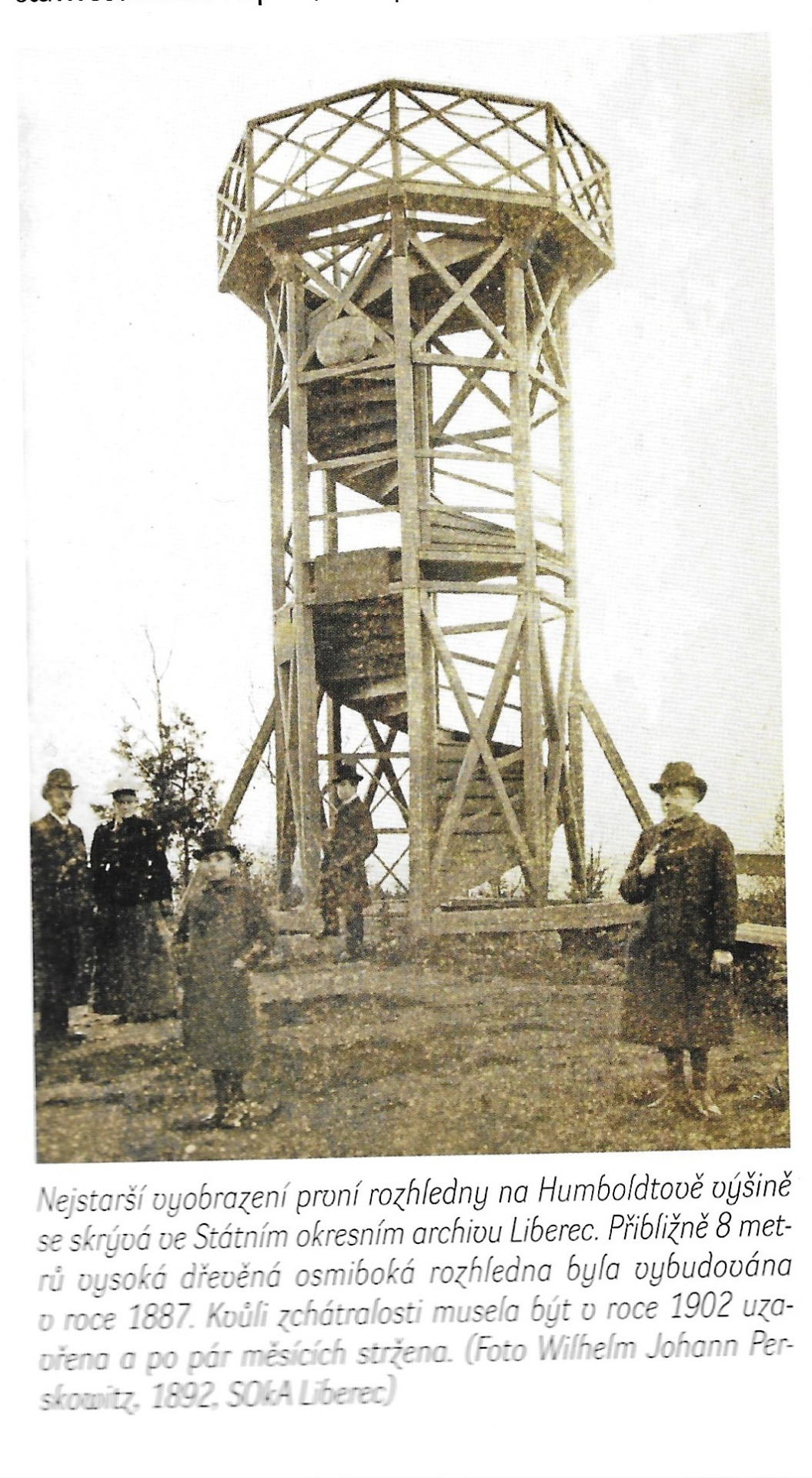 První pětimetrová dřevěná čtyřboká rozhledna nad Libercem byla vystavěna na Ještědu (1012 m n. m.) v roce 1876 a vydržela do roku 1889. První rozhledna na Humboldtově výšině (530 m) v Ruprechticích byla vystavěna jako dřevěná osmiboká věž v roce 1887 a dosloužila roku 1903. Stala se první rozhlednou postavenou Německým horským spolkem (zal. 1884).