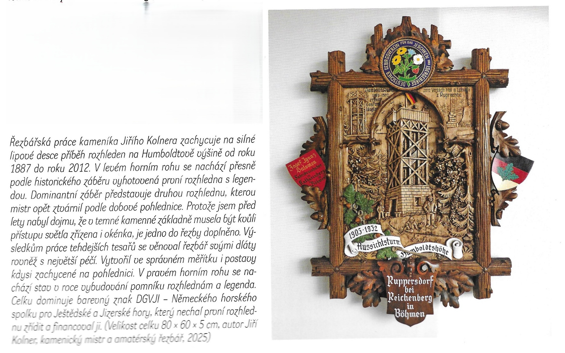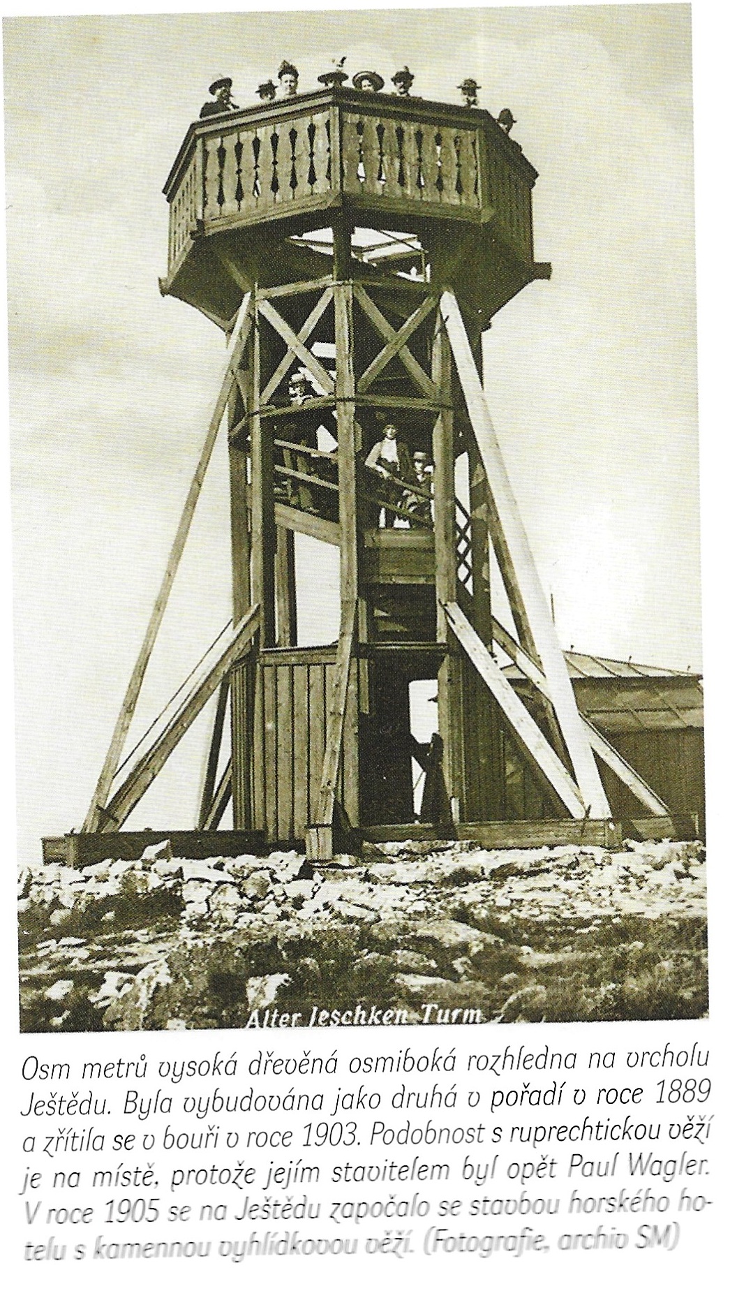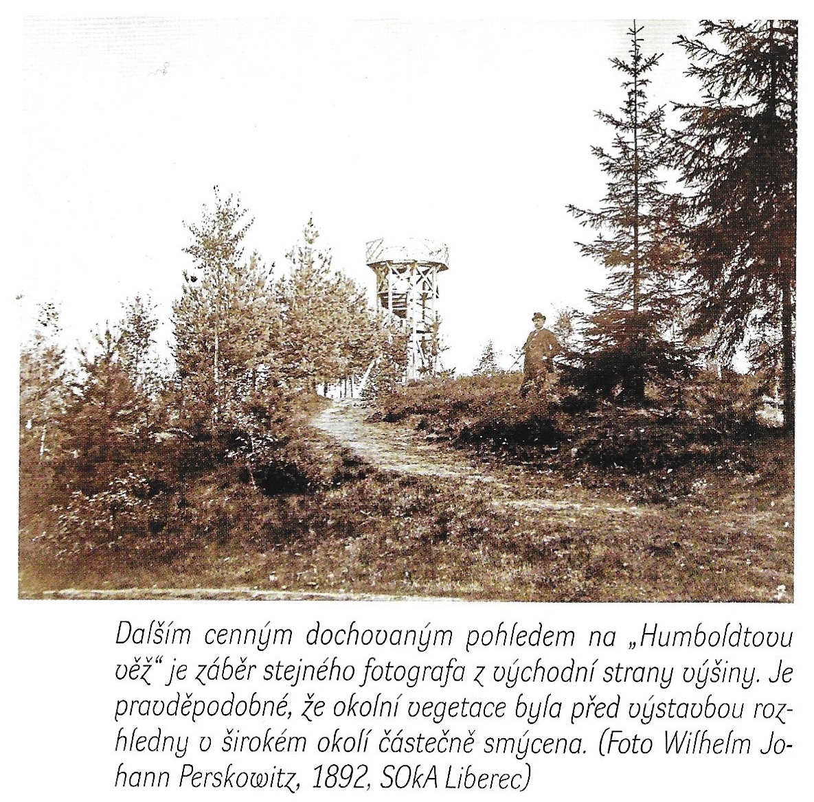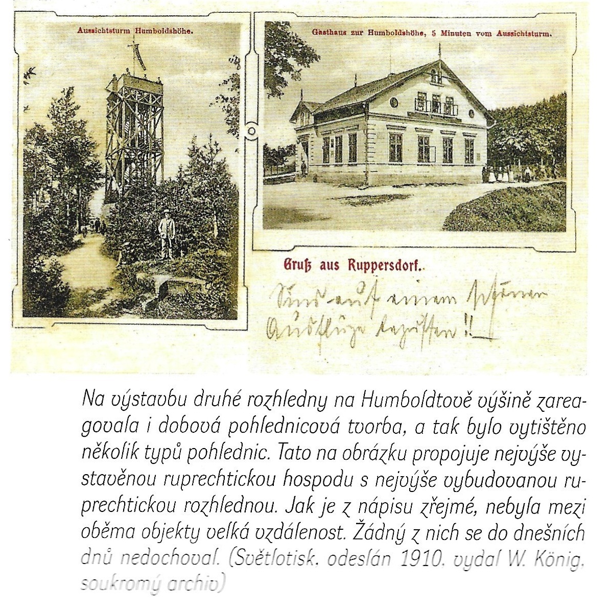 Všiml jsem si, že všichni doboví i současní autoři první rozhlednu popisují jako jen 5 m vysokou stavbu. | já jsem se řídil tímto údajem a bral jsem ho dlouhý čas jako daný fakt. Díky Petru Kurtinovi a pracovníkům libereckého archivu mohu s radostí předložit unikátní dobové fotografie Wilhelma Johanna Perskowitze z roku 1892. Zobrazená rozhledna nápadně připomíná druhou osmibokou rozhlednu na Ještědu a ne náhodou. Stavitelem obou byl Paul Wagler. Ten mimochodem vystavěl přibližně dva roky po ruprechtické rozhledně i druhou školní budovu na našem náměstí. Z archivního snímku Humboldtovy rozhledny lze vyčíst přibližně 40 schodů, a tak nám jejich počet přibližně urči i výšku. Měla by tedy být vysoká se zábradlím asi 8 m, to znamená stejně jako druhá rozhledna na Ještědu. Ta má oproti ruprechtické drobnou tesařskou odlišnost spočívající v opačné točitosti schodiště, ale hlavně ochranném vstupu a zesílení trámoví. Vynutily si to bezesporu drsnější klimatické poměry na Ještědu než na našem ruprechtickém hřbetu.