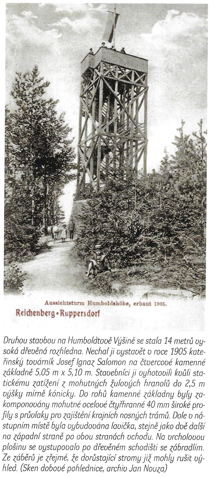 Horský spolek byl v tu dobu zaneprázdněn svým velkým ještědským projektem, a proto uvítal nabídku kateřinského továrníka Josefa Salomona, že novou rozhlednu na Humboldtově výšině zbuduje na své náklady. Skutečně se tak stalo a v létě 1905 již na stejném místě stála nová, opět dřevěná věž. Aby ji okolní stromy brzy nepřerostly, byla postavena na 2,5 m vysoké kamenné podezdívce s celkovou výškou 14 m. Továrník se zároveň zavázal, že rozhlednu bude na své náklady udržovat, což po řadu let svědomitě plnil, čímž si ve výročních zprávách spolku pravidelně vysloužil obligátní děkovný odstavec.