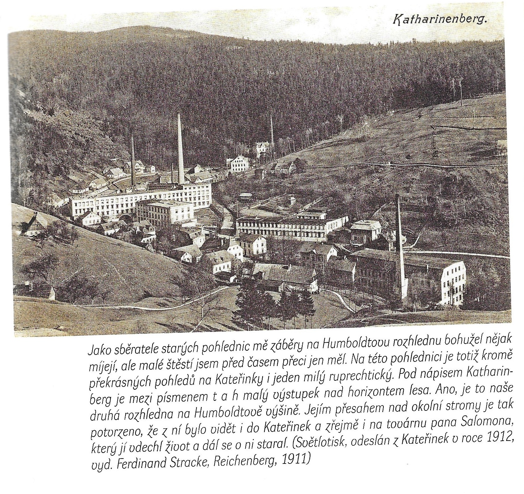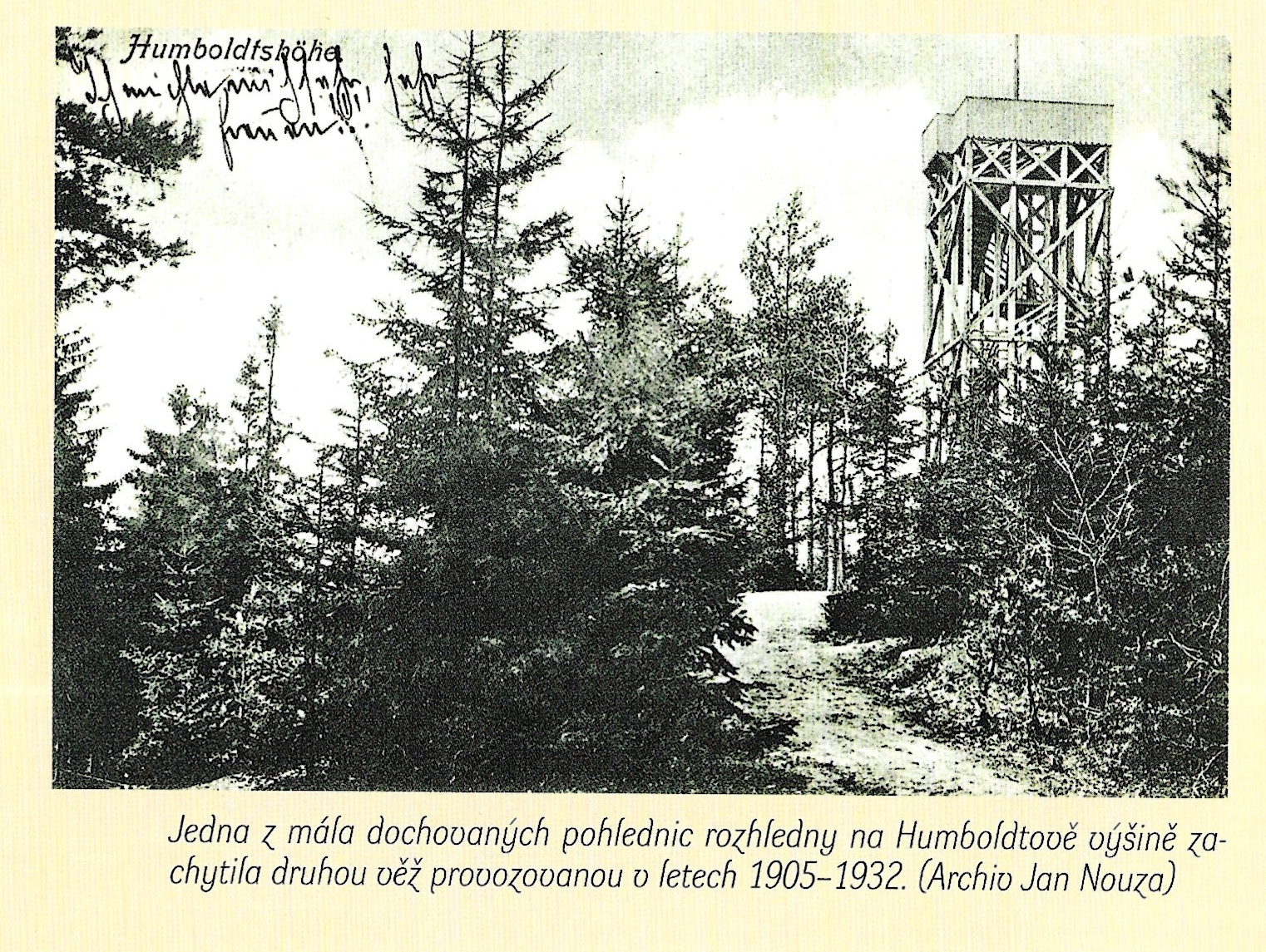 Úplně blízko Liberce, o dosahu pohodlných cest, zvedá se západní výběžek ruprechtického, popř. rudolfovského hřbetu — Humboldtova výšina, která je veřejností dosud příliš málo ceněna jako přitažlivé vyhlídkové místo. Příjemná, nenáročná procházka podél kasáren nás tam dovede za 40 minut. Zatímco před námi a vpravo od nás k nám zdánlivě stále blíž přistupují tmavě zalesněné svahy Jizerských hor, vlevo se náš pohled upírá volně do dálky, přes početné hezké a čisté domečky Ruprechtic, zastaví se na "Obrázkovém kopci" (Bildberg), dříve Weberově kopci, postavené, zdaleka viditelné, krásné stavbě "kostela U Obrázku" Dál pohled putuje po okolních početných pahorcích a dolinách bližšího a vzdáleného okolí, přes pomenší ruprechtický kostel se svou štíhlou věží až ke Krásnostudánecké výšině a nad ni, kde jej Výhledy (Gickelsberg) a Vysoký (Hohenwala) ohraničují na horizontu. Přejdeme okolo hostince "U Humboldtovy výšiny ; okročíme po několika krocích do lesa a za pět minut jsme u rozhledny. Rozhledna stojí uprostřed lesa a přesahuje navzdory své úctyhodné výšce přes orcholky smrků a jedlí jen svou vyhlídkovou plošinou, takže je zdálky sotva viditelná. Tady byla libereckým horským spolkem o roce 1887 na tenkrát ještě mladým lesem pokryté výšině postavena pět metrů vysoká dřevěná vyhlídková věž, která byla slavnostně otevřena 18. července 1887. Stavba byla provedena stavitelem Pavlem Waglerem z Liberce a vyžádala si náklady o výši 380 zlatých. Patnáct let vzdorovala věž vichřicím, větru a počasí, až v roce 1902 musela být uzavřena pro návštěvníky kvůli zchátralosti a v létě 1903 byla úplně snesena. Snahou libereckého horského spolku se podařilo získat ve velkoprůmyslníkovi panu Josefovi J. Salomonovi z Kateřinek mecenáše, který v roce 1905 na své náklady namísto staré rozhledny dal postavit novou krásnou vyhlídkovou věž. Nová věž je velmi solidně a účelně provedena a ozbuzuje velmi příznivý dojem. Je postavena ze dřeva, spočívá na 2a ½ metrové kamenné základně a spolu s nímá výšku 14 metrů. Plošina měří 2 x 4,20 metrů, takže se na ni vejde pohodlně 40 osob najednou. Z plošiny si užijeme skvělý rozhled přes vrcholky smrků a jedlí do nejbližšího okolí do libereckého údolí, jakož i na horské hřbety kolem dokola. U našich nohou leží na jihu rozprostírající se moře libereckých domů a potěší oko návštěvníka svými krásnými stavbami; krásně vyklenutý obrys Ještědu se svým majestátním vrcholkem vytváří nádherné pozadí. Na západ proniká pohled daleko přes údolí Nisy ke Hvozdu (Hochwald) a dalekým horám Žitavského pohoří, zatímco na severu a na východě omezuje výhled moře stromů a tooří na severu rámec pro hluboko pod námi ležící milostné údolí Kateřinek, se soými mnoha továrnami a početnými čistými domky, které jsou roztroušeny na horských úbočích až k impozantním Dračím kamenům. Čo se týká názvu Humboldtooa výšina, tam se názory rozcházejí, od kterého spolku a od kdy tato výšina obdržela své jméno. Ročenky Spolku přátel přírody o tom nic nevypovídají a na mnohé osobní dotazy o Liberci a Ruprechticích, jakož i u starších členů libereckého horského spolku jsem získal informaci, že výšina obdržela své jméno při otevření proní rozhledny na počest přírodovědce Alexandra oon Humboldta (1769-1859). Naproti tomu mne upozornil pan profesor Franz Hůbler ze Štýrského Hradce (Graz), na kterého jsem se v této věci obrátil, na Zprávy horského spolku (Mitteilungen des Gebirgsvereines) z roku 1887, ve kterých je výslovně uvedeno, že horský spolek se svého času usnesl, že "na tak zoané Humboldtově výšině" zřídí rozhlednu. Z toho důvodu tedy horský spolek není tvůrcem tohoto názou. Také v listinách obecního úřadu Ruprechtice se o tom nic nedá najít. V zájmu regionální vlastivědy by bylo objasnění této otázky určitě přínosné. Možná, že někdo z okruhu čtenářů by mí mohl podat fundovanou informaci.