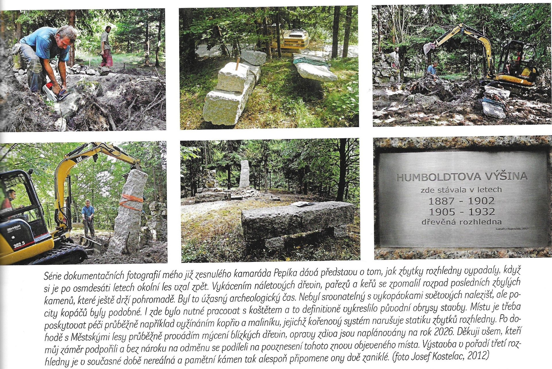 Děkuji firmě Ligranit, Že jsem si mohl pro svůj záměr vylomit vhodný obelisk z lomu Wágner l. Místo pro pamětní desku vysekal kameník Miroslav Šulc. Obrovského podílu práce se zhostil lamač Karel Vidlák, kterého jsem pro záměr nadchl a který dodal sil, kolik bylo třeba. Jednoho letního odpoledne se tak po naší lomařské směné výšinou rozléhala motorová pila odstraňující nálety a polomy, cinkaly krumpáče, lopaty, a hlavně tiše předl malý bagr, který bravurně vedl lesem Miroslav Vosáhlo. Uvázaný dvoutunový kámen se ke konci dne podařilo úspěšně postavit do základů a kvůli stabilitě ještě obsypat kameny. Jak se totiž ukázalo, základy rozhledny byly založeny na monolitické žulové plotně. Aby se dalo před novou tváří rozhledny dobře posedět, byl zapuštěn do trhlin ve skále přivezený bezmála tunový hranol, který spojený dalšími dvěma menšími hranoly vytvořil lavici.