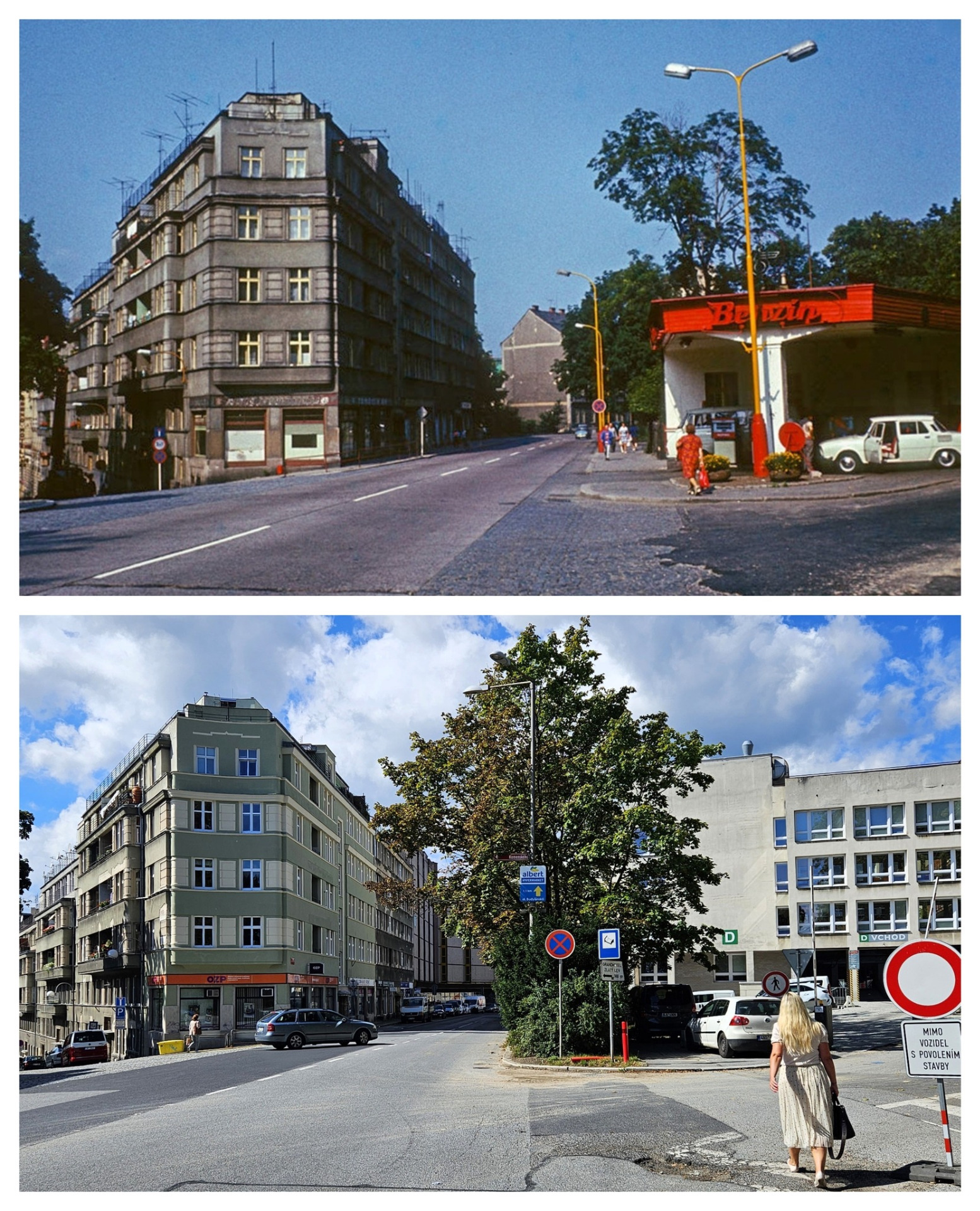 Na rozdíl od počátku sedmdesátých let minulého století již na současném snímku (září 2025) nároží Jablonecké a Gutenbergovy ulice v Liberci nestojí čerpací stanice Benzina, jejíž historie sahala hluboko do dob první republiky. V 80. letech ji nahradila strohá budova léčebny dlouhodobě nemocných. Ve stejné době vyplnil proluku mezi domy, která zeje uprostřed staršího snímku, objekt ubytovny Krajské nemocnice Liberec.