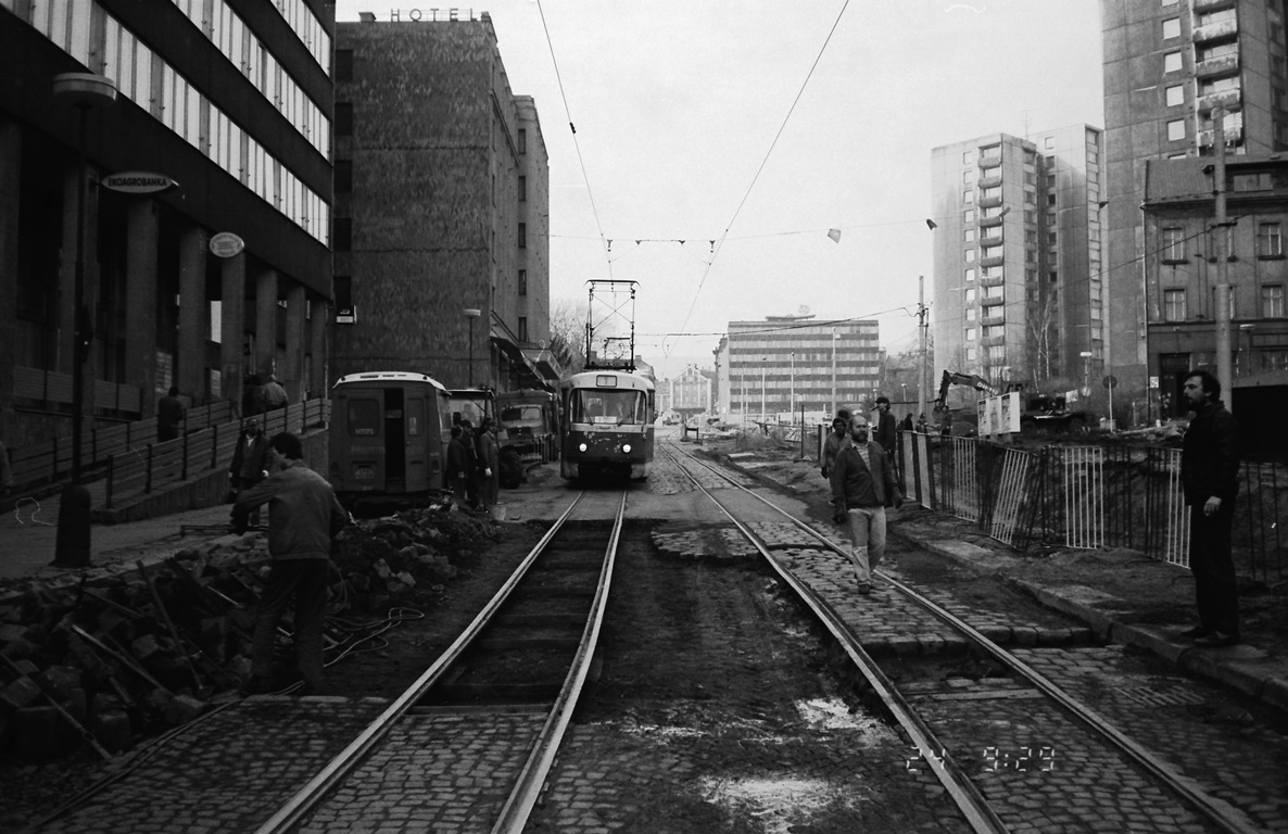 středa 14.2.1993, Liberec, třída 1. máje, vkládání výhybky jako příprava pro zjednokoljnění rekonstruovaného úseku: