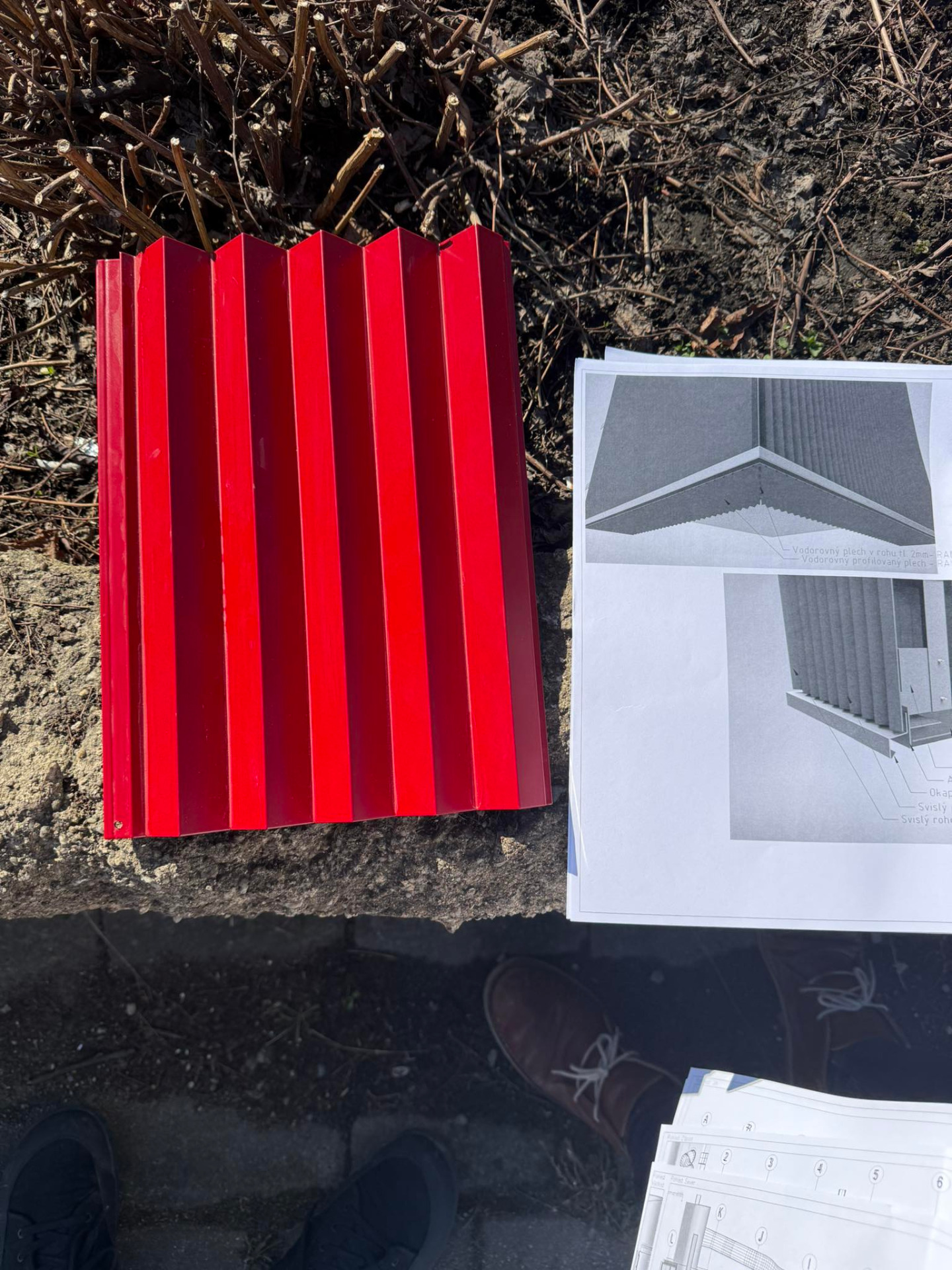 zářivě bílé keramické půlválce kontrastující s rudou, přísně pravoúhlou
