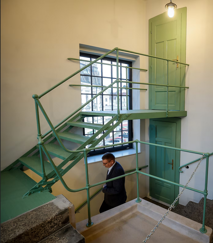 zrekonstruovanou budovu propojuje tříramenné schodiště a výtah. V