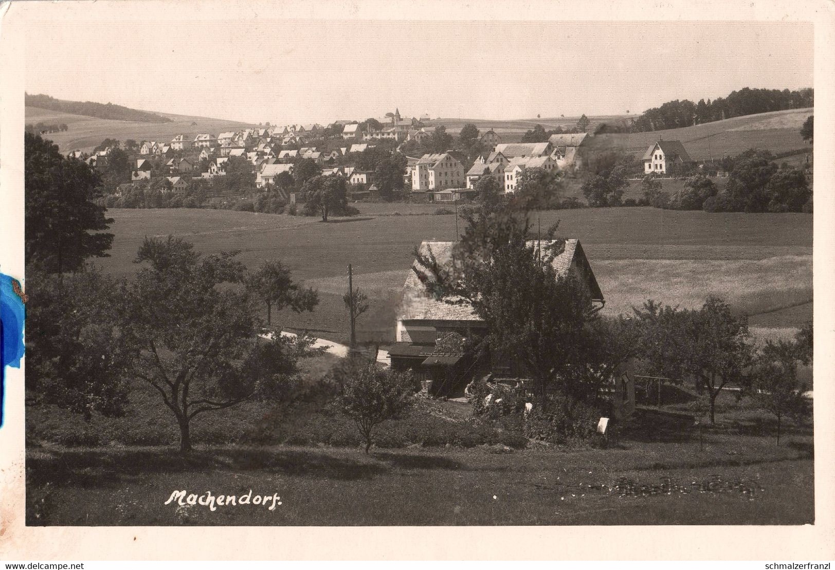 Dům v horní části pohlednice odeslané roku 1902 dosud stojí a to přímo proti machnínskému nádraž při železniční trati z Liberce do Žitavy z roku 1859. Dlouho sloužil Jako nádražní restaurace, dokonce ještě ast deset let po druhé světové válce. V letech 1956-1976 patřil libereckému Ústřednímu kontrolnímu a zkušebnímu ústavu zemědělskému. Dnes - po důkladné modernizací - je z něj obytný dům. V dolní čásu pohlednice je rozlehlá textiní továrna vídeňského průmyslníka Adolfa Schwaba v osade Hamrštejn. Textlku koupil roku 1875 od firmy Stegmund & Neuháuser, která ji budovala od roku 1826. Tehdy byla největší textikou na Liberecku. Původní výrobu suken změnil A. Schwab na výrobu bavlněných látek a na přádelnu. Dům v pozadí je továrníkova vila