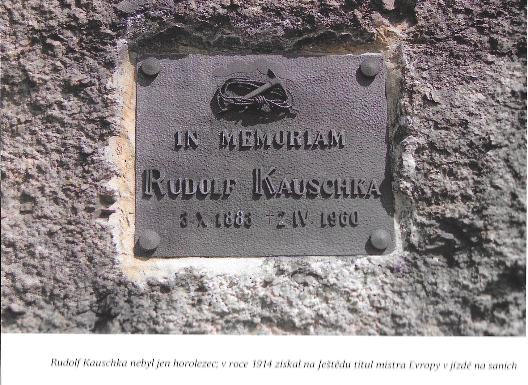 Rudolf Kauschka byl přítelem Gustavova otce, starého pana Ginzela. Ten před desetiletími svolil, abych si opsal dopis, který mu kdysi Kauschka poslal a který se týká právě Náhrobku, skály, na které proslulý jizerskohorský horolezec a autor známé knihy Wandern und Klettern sedával nejraději a do které proto Sigi Weiss umístil jeho tabulku. Nevím ale, přestože překládal i Kauschkovy básně, jestli Sigi Kauschkův dopis o skále Náhrobku zná. Bezpochyby také shořel před třinácti lety na Jizerce. Takže, možná, i tyhle Kauschkovy řádky jsou již unikátem: "Jdeme-li vzhůru Kozí stezkou, přijdeme přibližně naproti "Nosu" ke čtyřhrannému skalnímu bloku, který stojí při pravé straně cesty. Pohlédneme-li odtud nebo z nejbližšího okolí nahoru, zahlédneme také "Náhrobek dost významnou skalní kupu, součást hřebene, který ohraničuje na jižní straně masiv Frýdlantského cimbuří. Vystoupili jsme k němu tenkrát, přicházejíce odspoda, tenkou spárou na levé straně. Přicházejíce sem odshora, můžeme po zmíněném hřebenu proniknout až na štít střechy a potom skrze zářez dojít na ukloněnou plochu, nad níž se zvedá svislá štítová stěna, místo, kde jsem velmi často sedával" Jednu z nejhezčích pamětních tabulek věnovali horolezci Rudolfu Kauschkovi. S láskou ji zhotovil Siegfried Weiss a s přáteli ji v roce 1961 umístili pod převisem skály Náhrobek.