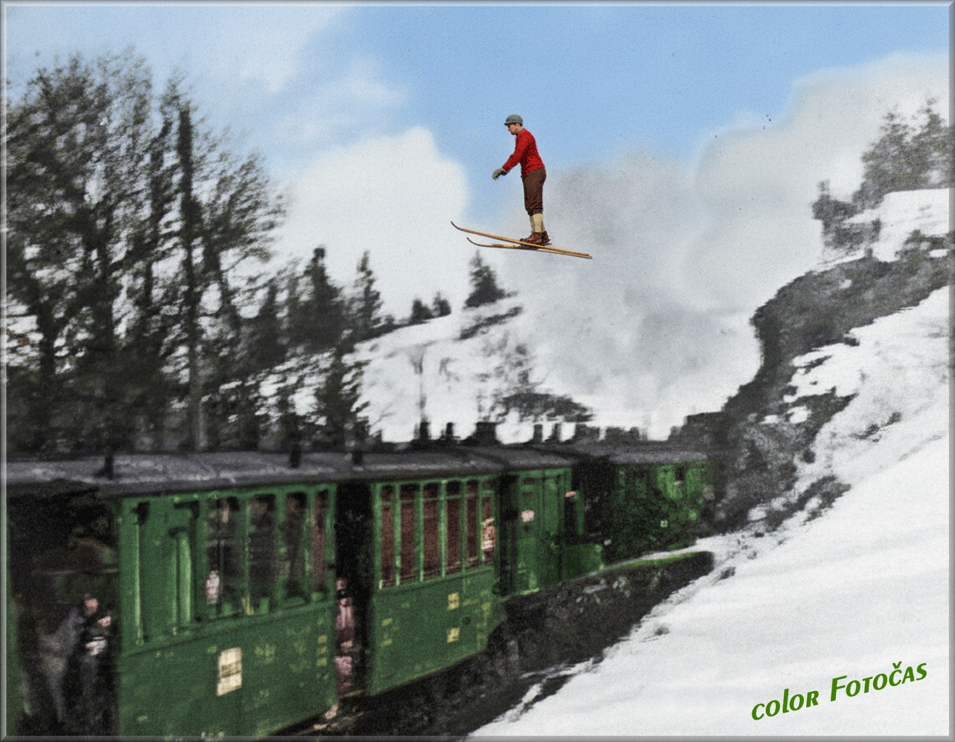 Na trati Možná šlo o recesi, možná o sázku, ale každopádně to byla paráda a odvaha....Před osmdesáti lety se u nás uskutečnil jeden z nejkurióznějších sportovního výkonu na lyžích. Jeho autorem nebyl Jára Cimrman, jak by se dalo předpokládat, ale Franz Kirschner z Jabloneckých Pasek. Podařilo se mu přeskočit vlak jedoucí z Pasek do Lučan. Nad tratí si předem připravil sněhový můstek a odvážně skočil. Kupodivu se mu nic nestalo. Jen následně prý měl obavy, aby nebyl za svůj chrabrý skutek vyznamenán pokutou od četníků. Jeho kamarád Erich Tham skok zdokumentoval, a tak víme, že se 24. března 1928 zrodilo v Jablonci extrémní lyžování..............................................Tato barevná fotografie zachycuje jedinečný a zábavný okamžik – lyžařský skokan v typickém dobovém úboru letí vzduchem vysoko nad zeleným vlakem na trati Liberec–Tanvald, která je známá svým technicky náročným horským profilem a historickou hodnotou jako nejstrmější železniční trať v Česku. Snímek je zřetelně kolorovaný a působí jako nostalgická připomínka dávné doby, kdy sportovní akce a železniční doprava často tvořily zajímavé kulisy i náměty pro dobové fotografy.Železniční trať Liberec–Tanvald byla a je spojována s mnoha technickými rekordy – maximální sklon až 58 ‰, významná převýšení i unikátní ozubnicová technika – a v zimních měsících tvořila inspirativní pozadí pro místní sportovní aktivity, jako právě skoky na lyžích. text Copilotcolor Fotočas Mirek