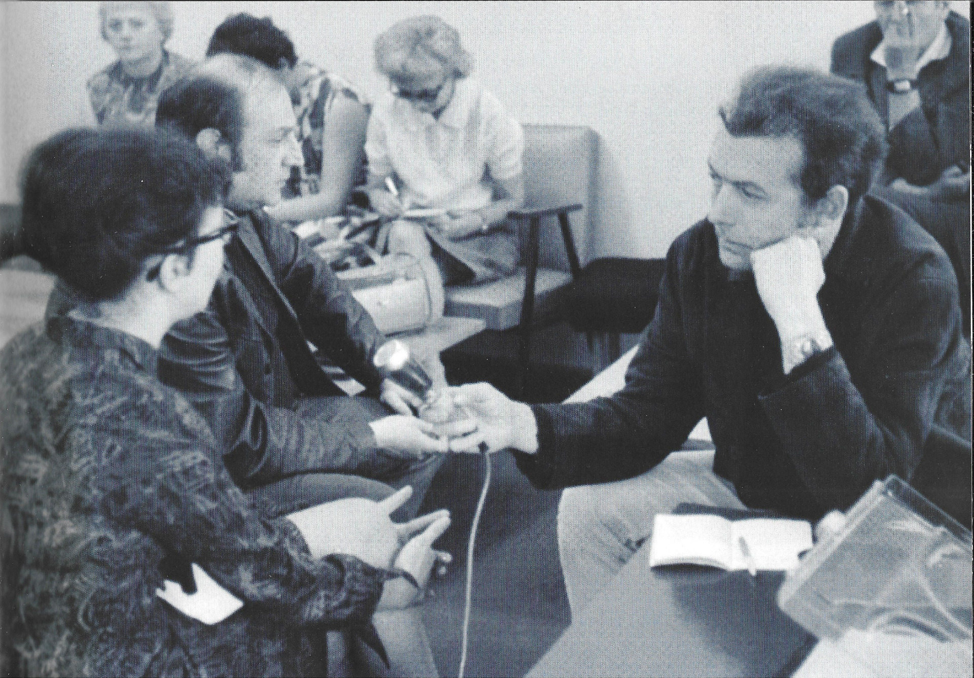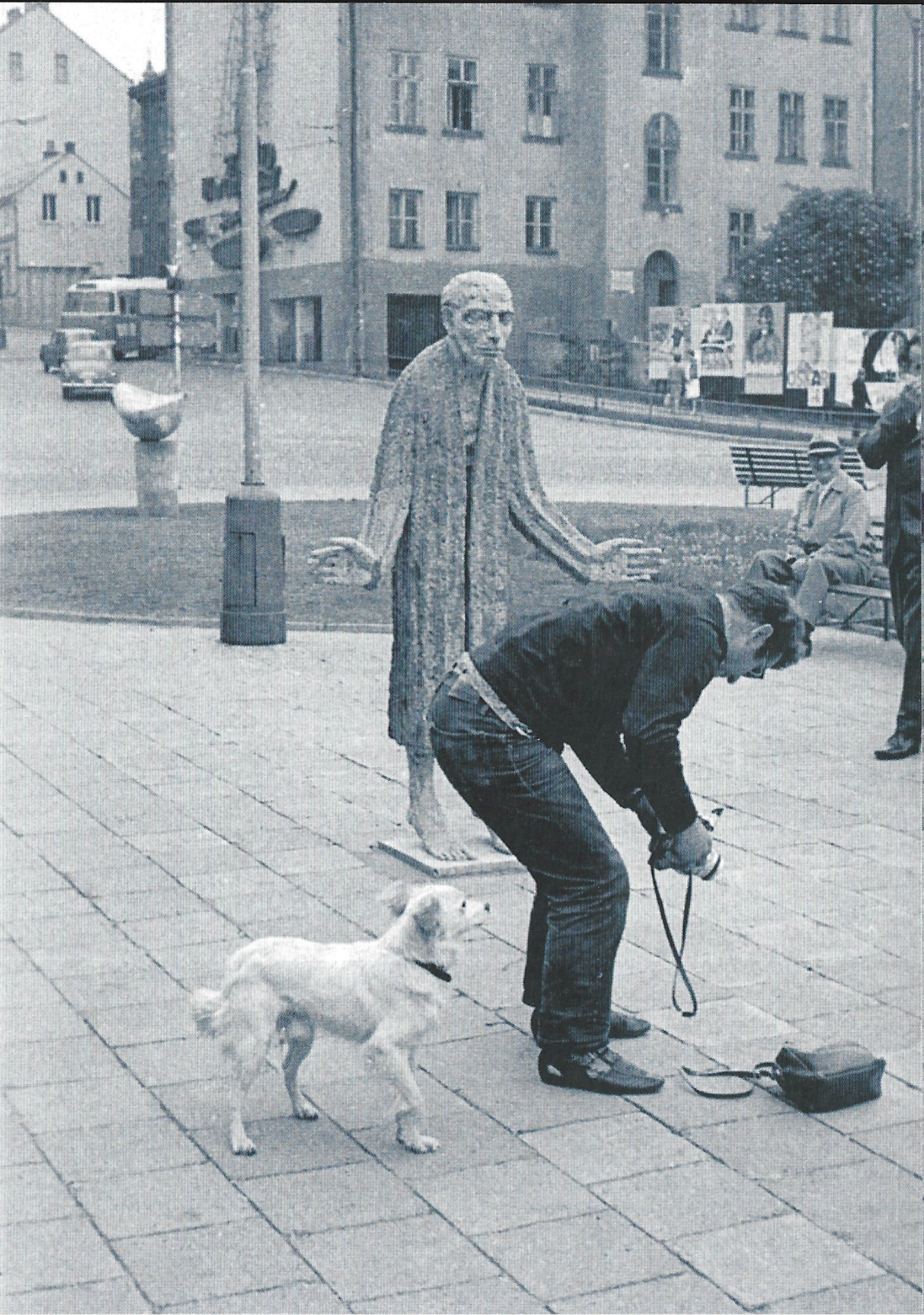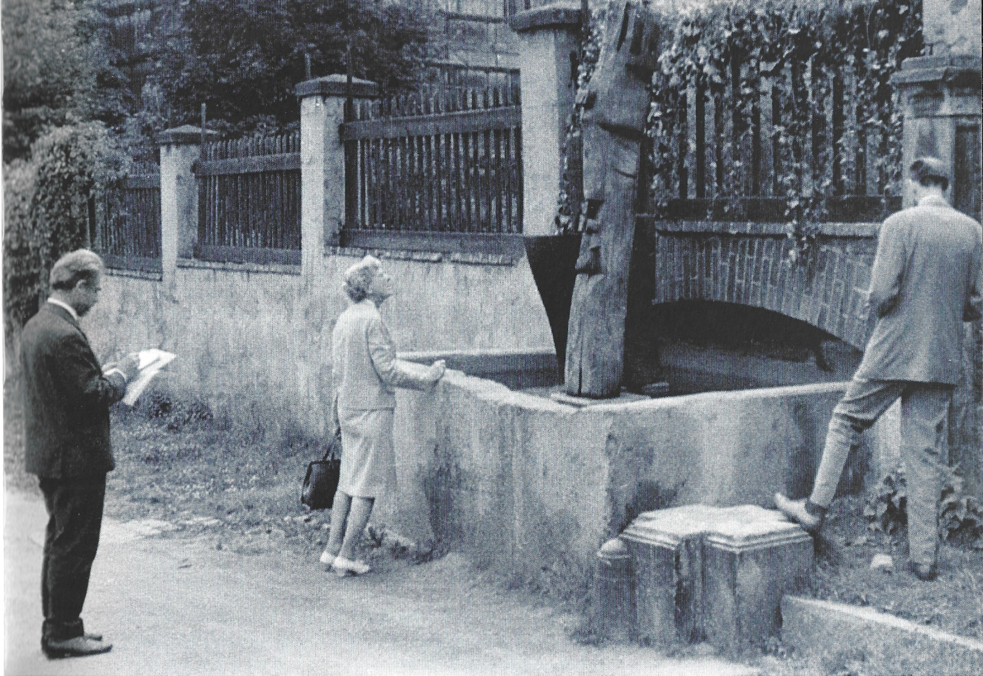 Mezinárodní komise pro udělení Ceny M.Brauna nejlepším sochařům na obhlídce soch. Zleva: Josef Patrný, Carola Giedion-Welcker, Jiří Šetlík. U sochy Jiřího Seiferta Křeslo a sloup před Oblastní galerií v Liberci.