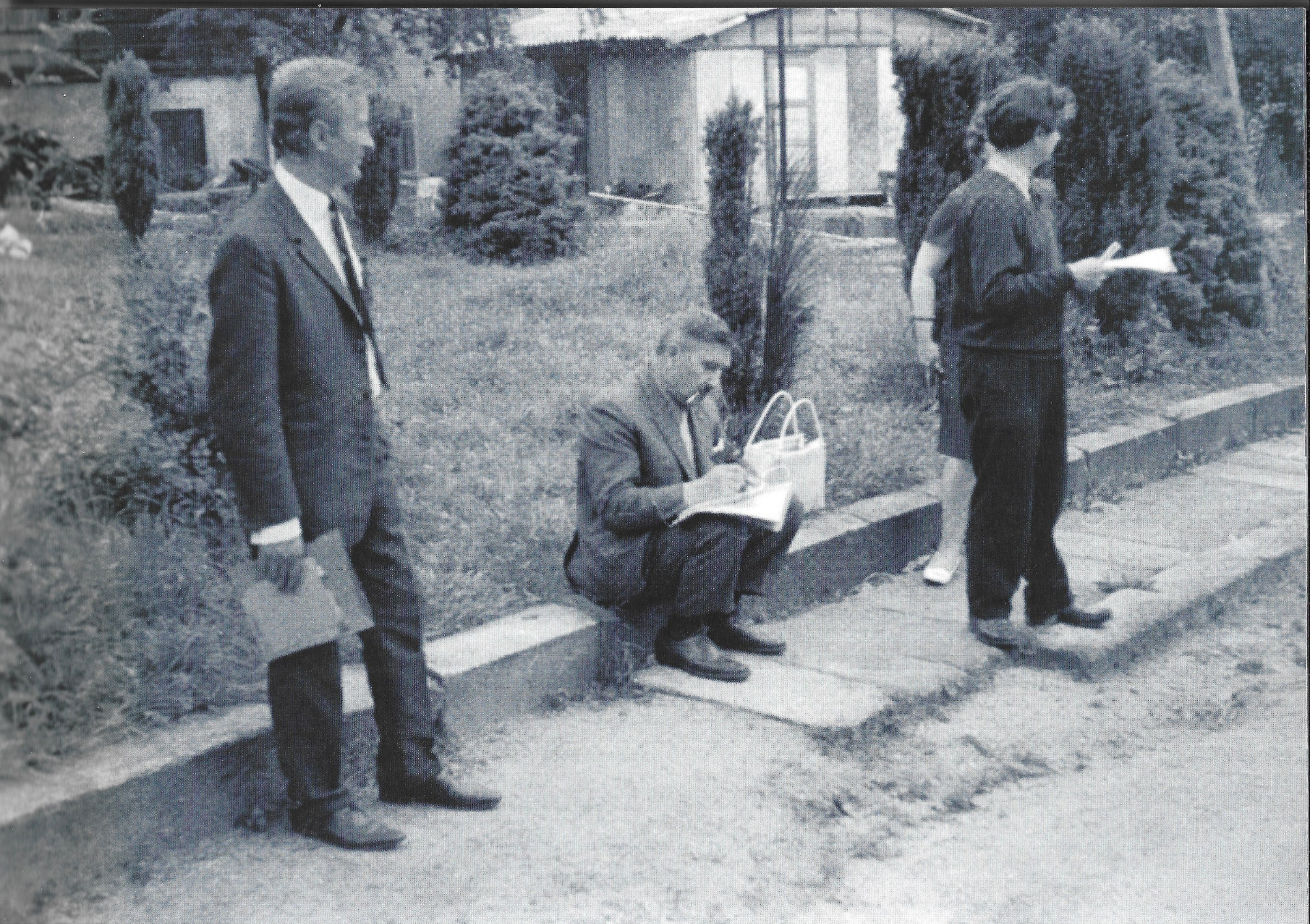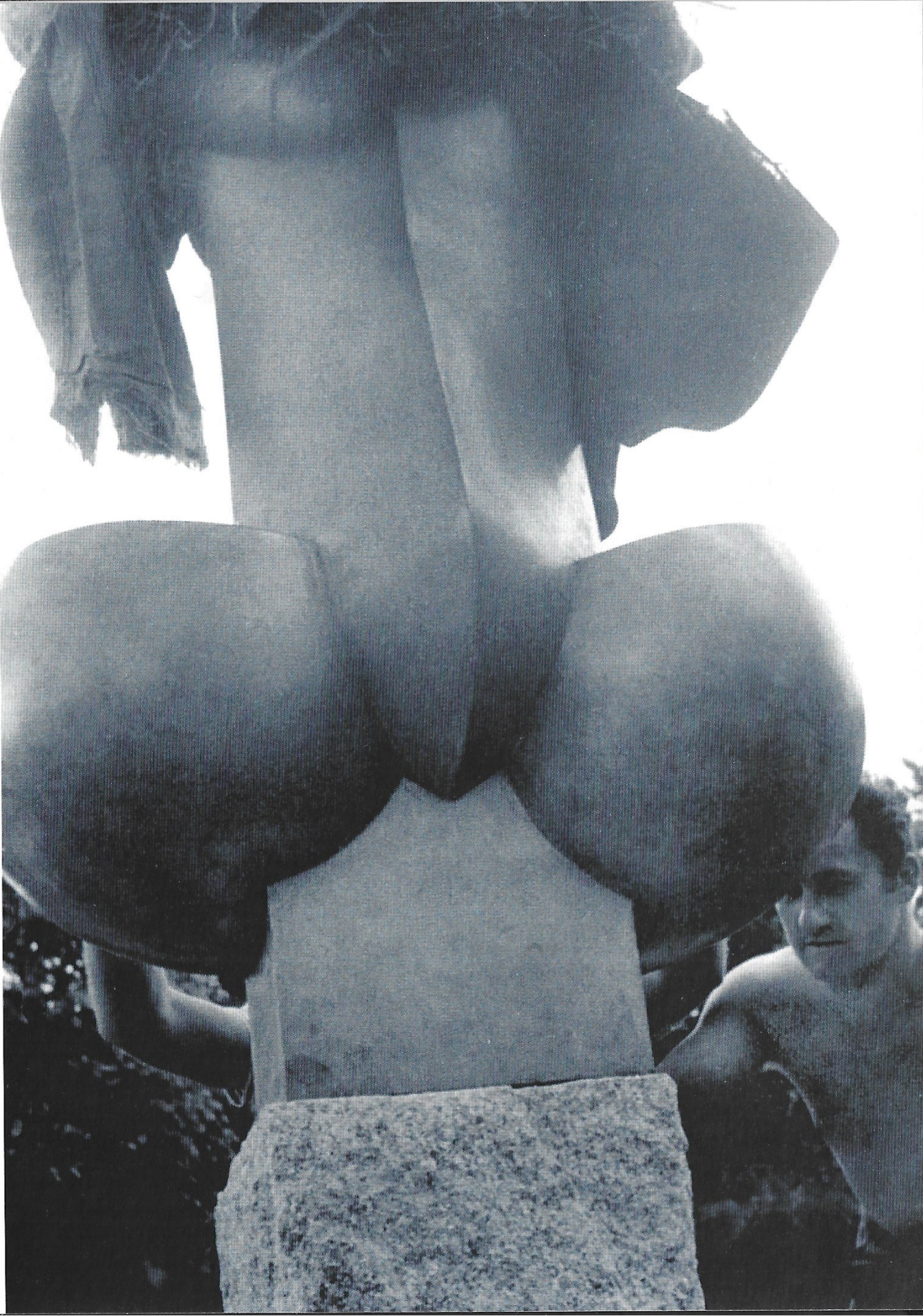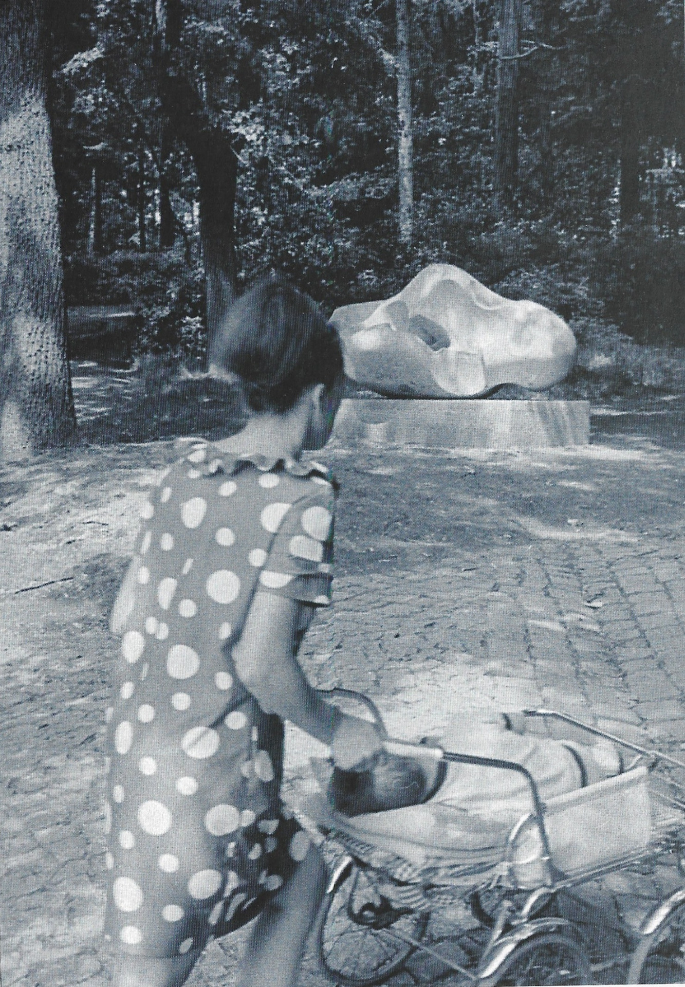 Mezinárodní komise pro udělení Ceny M.Brauna nejlepším sochařům na obhlídce soch. Zleva: Josef Patrný, Carola Giedion-Welcker, Jiří Šetlík. U sochy Jiřího Seiferta Křeslo a sloup před Oblastní galerií v Liberci.