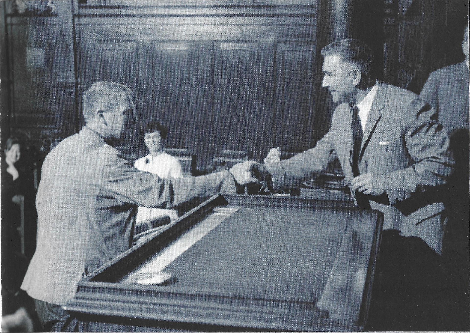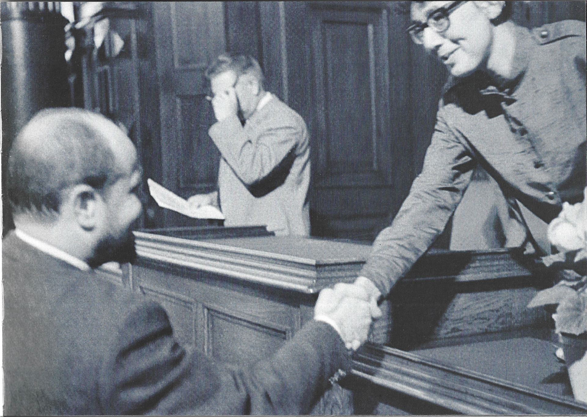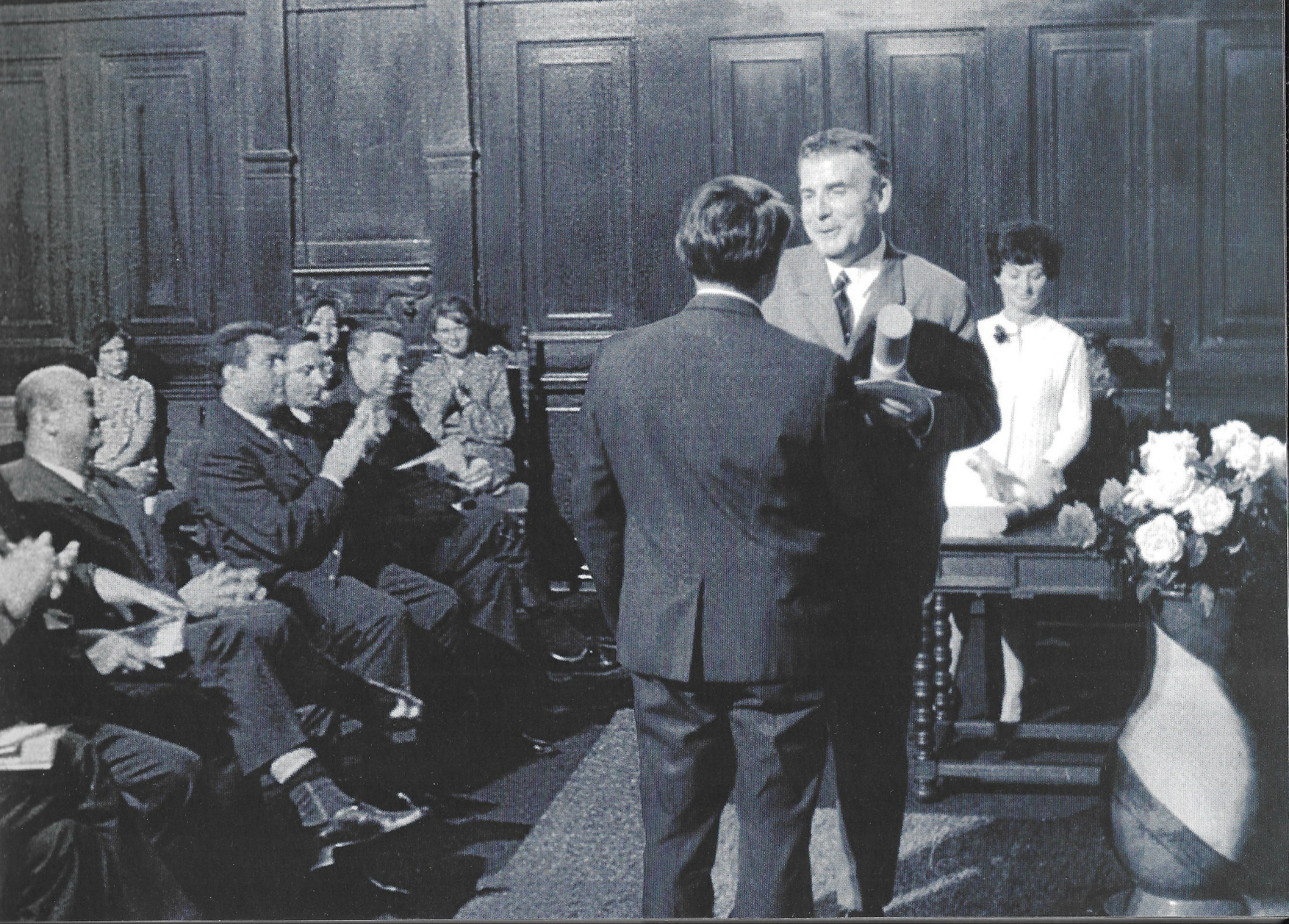 Předávání cen Matyáše Brauna. Hana Seifertová, kurátorka výstavy, gratuluje Aleši Veselému za převzetí Ceny Matyáše Brauna I.stupně. V pozadí Ladislav Janecký (náměstek předsedy MěstNV Liberec).