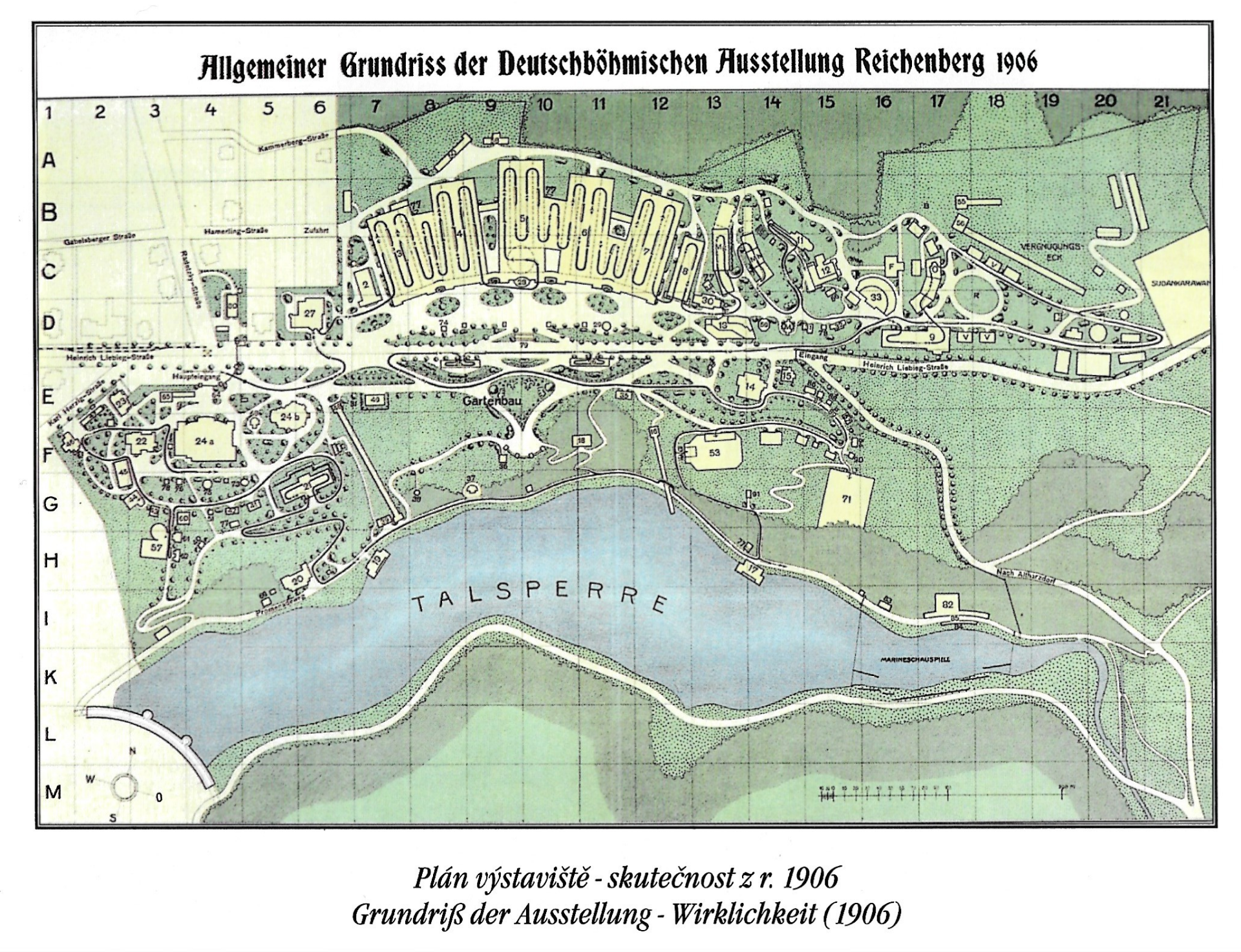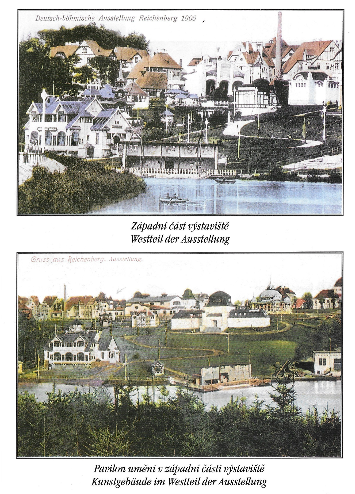 Od jara do začátku podzimu roku 1906 prožívali obyvatelé Liberce a okolí velkolepou podívanou. Ve stráni nad jezerem nové přehrady a na plochách kolem dnešní Husovy třídy, nesoucí tehdy jméno Heinricha Liebiega, se konala výstava, která neměla v Liberci a v severních Čechách obdoby. Po levé straně nové městské tepny směřující k Jizerským horám byla k vidění mohutná výstavní budova sestávající z pěti hal, na pravé straně ve svahu k vodní hladině celá řada větších, menších i docela matých pavilonů nejrůznějších podob. V zadní části výstaviště lákala k návštěvě alpská vesnička a vysoko nad ní uměle vybudované panorama Alp se skutečnými Jizerskými horami v pozadí. Ze dvou teras na břehu jezera mohli zájemci sledovat loďky plující po hladině, z divácké tribuny zase námořní bitvy, nebo čluny naplněné pasažéry, řítící se po kolejích ze stráně až na vodní plochu. Jinou atrakcí byl výtah - ozubnicová dráha dopravující návštěvníky od přehrady vzhůru, do prostoru, kde ve stráni vpravo od hlavního vchodu byla soustředěna řada pavilonů.